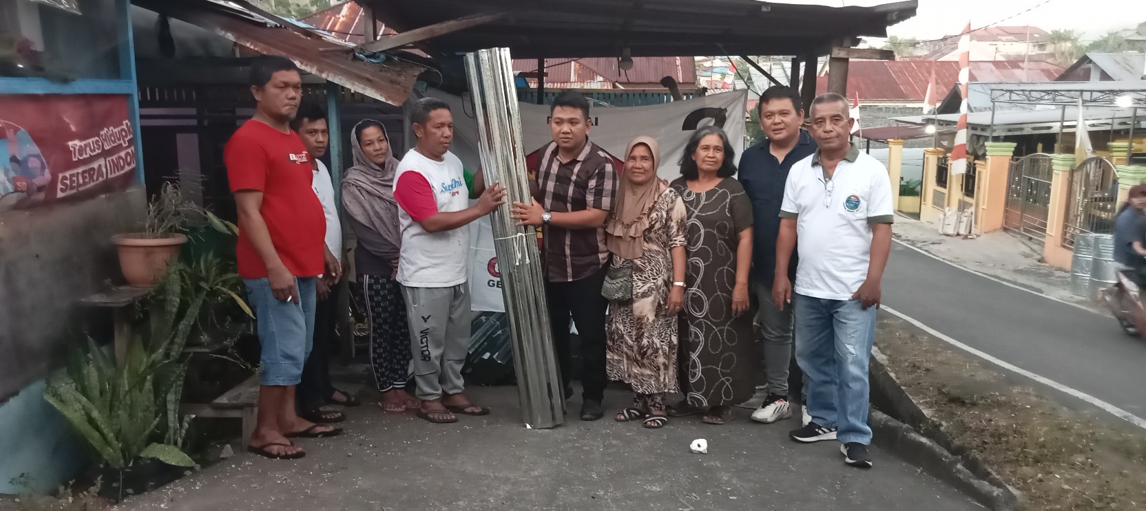 Ketua Dewan Pimpinan Cabang (DPC) Partai Gerindra Kota Bitung, Randito Maringka serahkan bantuan 100 lembar seng kepada keluarga Rahim Malendes.