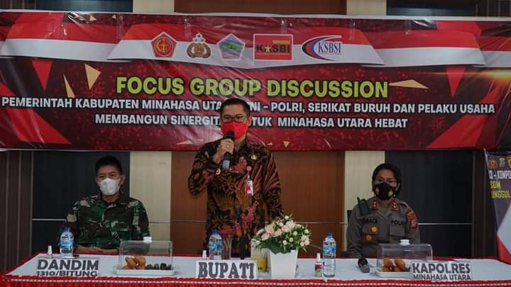 “Mari senantiasa kita tetap disiplin dengan protokol kesehatan Covid-19 dan dalam rangka menjaga kondusifitas masyarakat di Kabupaten Minahasa Utara berkaitan dengan Hari Buruh pada besok hari, dalam FGD tdi kita sudah sepakat bahwa tidak melakukan gerakan mengumpul massa yang seperti biasanya dilakukan pada saat May Day, tetapi kita sudah sepakat untuk kita melakukan aksi yang ada kaitannya dengan Covid-19, yaitu dengan bagi-bagi masker dan hand sanitizer,” ujar Bupati Joune Ganda.