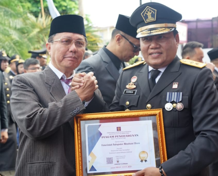 Penghargaan diserahkan langsung oleh Kakanwil Kemenkumham Sulut, Kurniaman Telaumbanua, kepada Sekretaris Daerah Minut, Novly Wowiling, mewakili Bupati Minut dalam peringatan Hari Bhakti Pengayoman ke-80, Jumat (22/08/25).