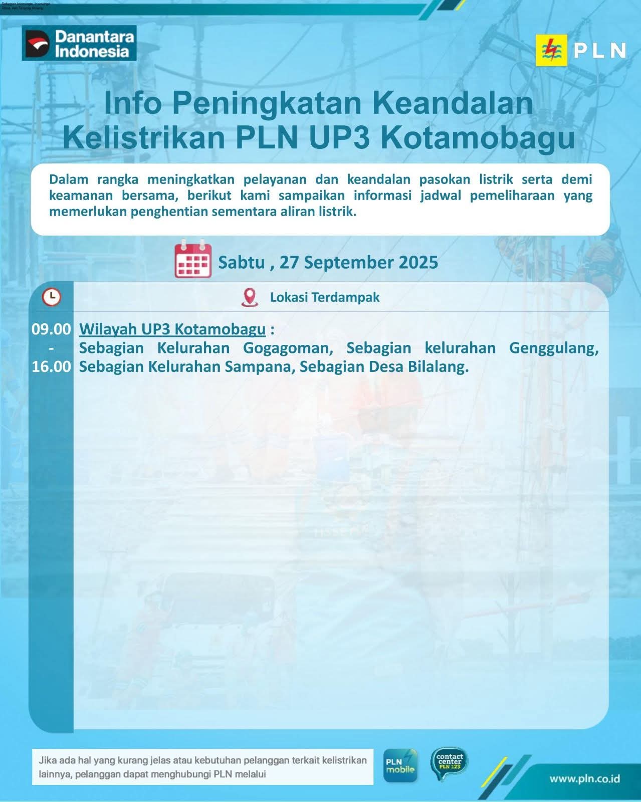 ZONAKAWANUA.COM_ Dalam upaya meningkatkan keandalan pasokan listrik dan kualitas pelayanan kepada pelanggan, PT PLN (Persero) Unit Pelaksana Pelayanan Pelanggan (UP3) Kotamobagu akan melaksanakan pekerjaan pemeliharaan jaringan listrik pada besok, Sabtu (27/09/25).