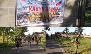 Karya Bakti bersih-bersih jalan dan selokan air melibatkan 25 personel TNI dan 20 warga setempat, dimulai sejak pukul 06.00 WITA dengan peralatan sederhana seperti mesin rumput, sapu lidi dan sekop.