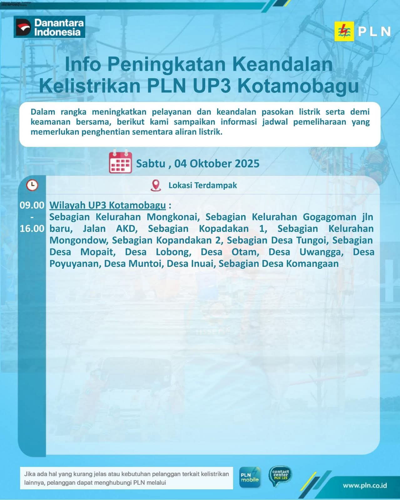 ZONAKAWANUA.COM_ Dalam upaya meningkatkan keandalan pasokan listrik dan kualitas pelayanan kepada pelanggan, PT PLN (Persero) Unit Pelaksana Pelayanan Pelanggan (UP3) Kotamobagu akan melaksanakan pekerjaan pemeliharaan jaringan listrik pada besok, Sabtu (04/10/25).