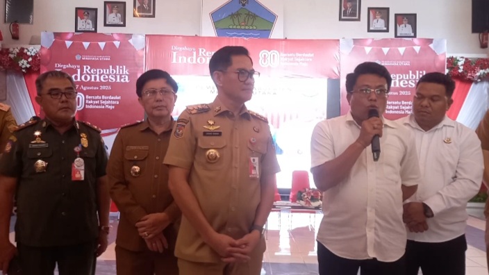 Bupati Joune Ganda bersama Kajari Minut, I Gede Widhartama dalam konferensi pers di Atrium Kantor Bupati Minut, Senin (13/10/25. foto; Immora