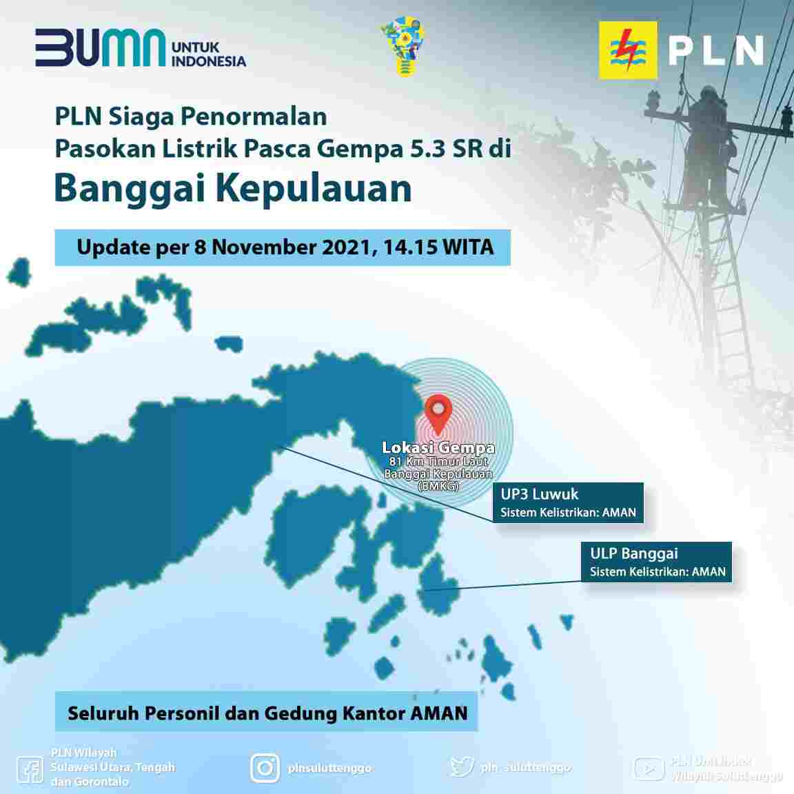 Saat ini, info update per pukul 14.15 WITA untuk semua sistem kelistrikan dipastikan aman di seluruh unit yang berada dibawah PLN Unit Pelaksana Pelayanan Pelanggan Luwuk, serta seluruh personil dan aset PLN juga dipastikan aman.